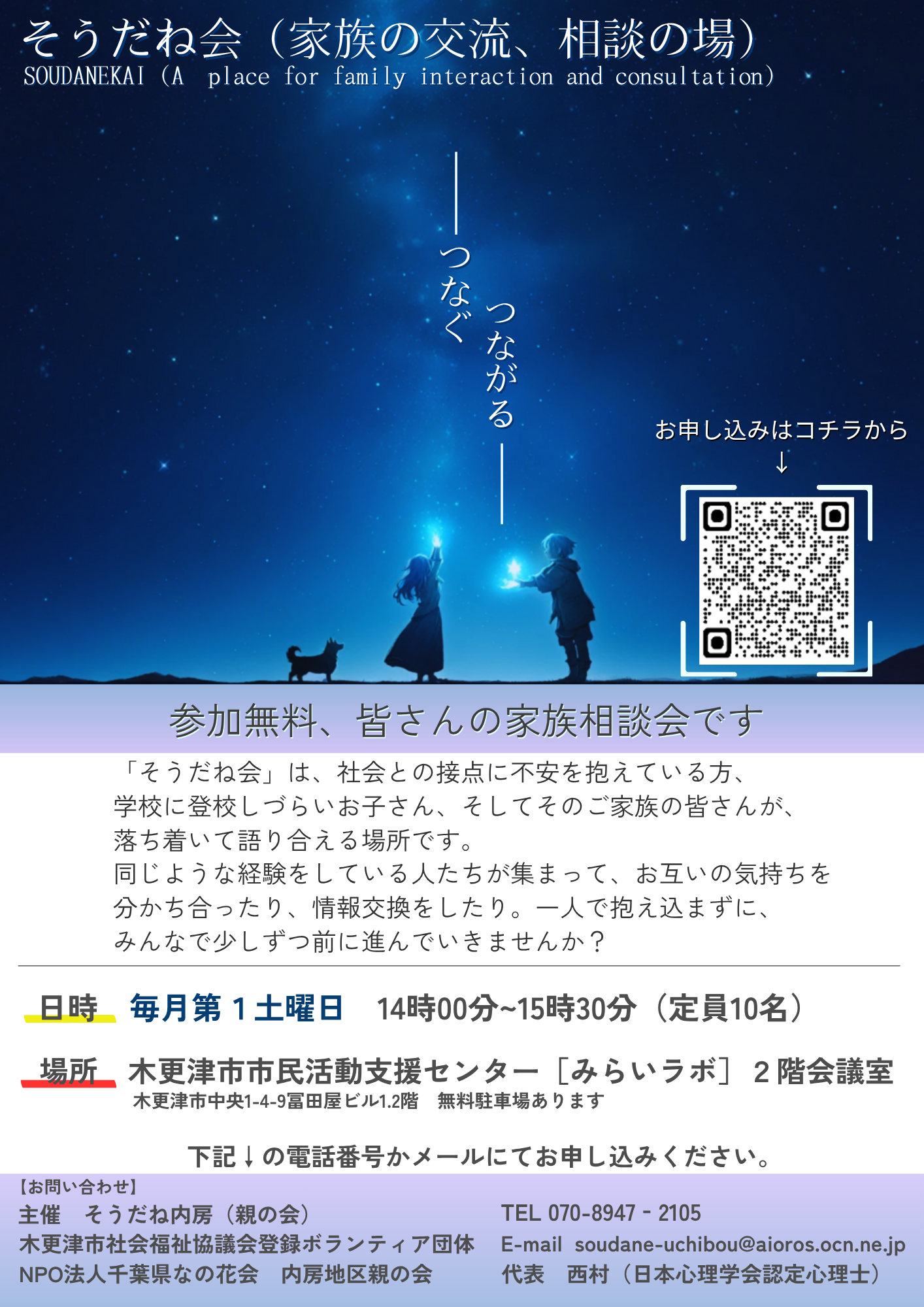 「そうだね内房(そうだね会)」は、ひきこもりや学校への登校が難しいなどの悩みを抱えるご家族が、**安心して交流し、学び、相談できる場を提供するボランティア団体です。 — 活動内容 家族交流・相談の場 学びの場の提供 専門家による支援 — 最近の取り組み – 定例会「そうだね会」の開催(2025年9月は5名が参加、新規参加者1名) — 今後の予定(2025年度後期~2026年) 11月1日(土) 第1回ひきこもり家族教室「ひきこもりのメカニズム」 家族交流・相談の場は**毎月開催**を基本とし、参加者の状況やご要望に応じて内容を柔軟に調整しています。 — 団体からのメッセージ ひきこもりやさまざまな困難を抱えるご家族が、安心して話せる・つながれる場所」を目指しています。 — ※活動日程や詳細は随時更新されますので、最新情報は市民活動支援センターまたは「そうだね内房」までお問い合わせください。 ■お問い合わせ |