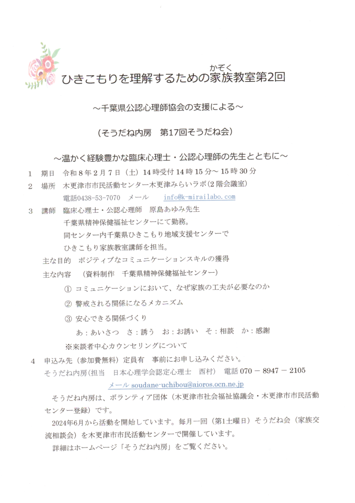 当センター登録団体「そうだね内房」様より、ご家族の絆をより深めるための温かな講座を