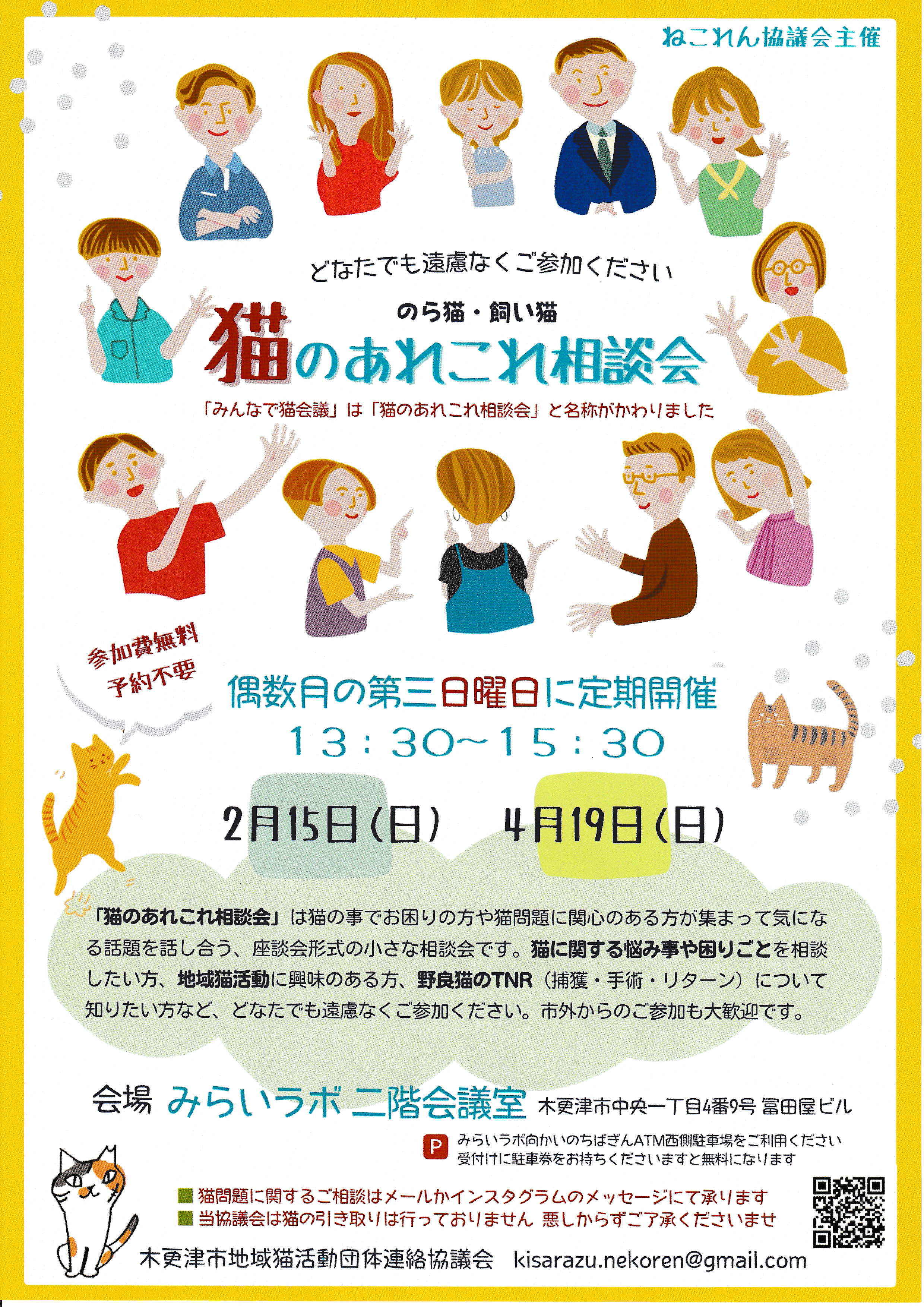 猫のあれこれ相談会は、猫の事でお困りの方や猫問題に関心のある方