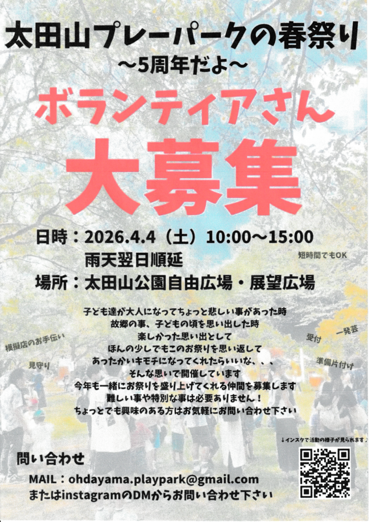 当センター登録団体『太田山プレーパーク』より お祭りのボランティアに関するお知らせです。
