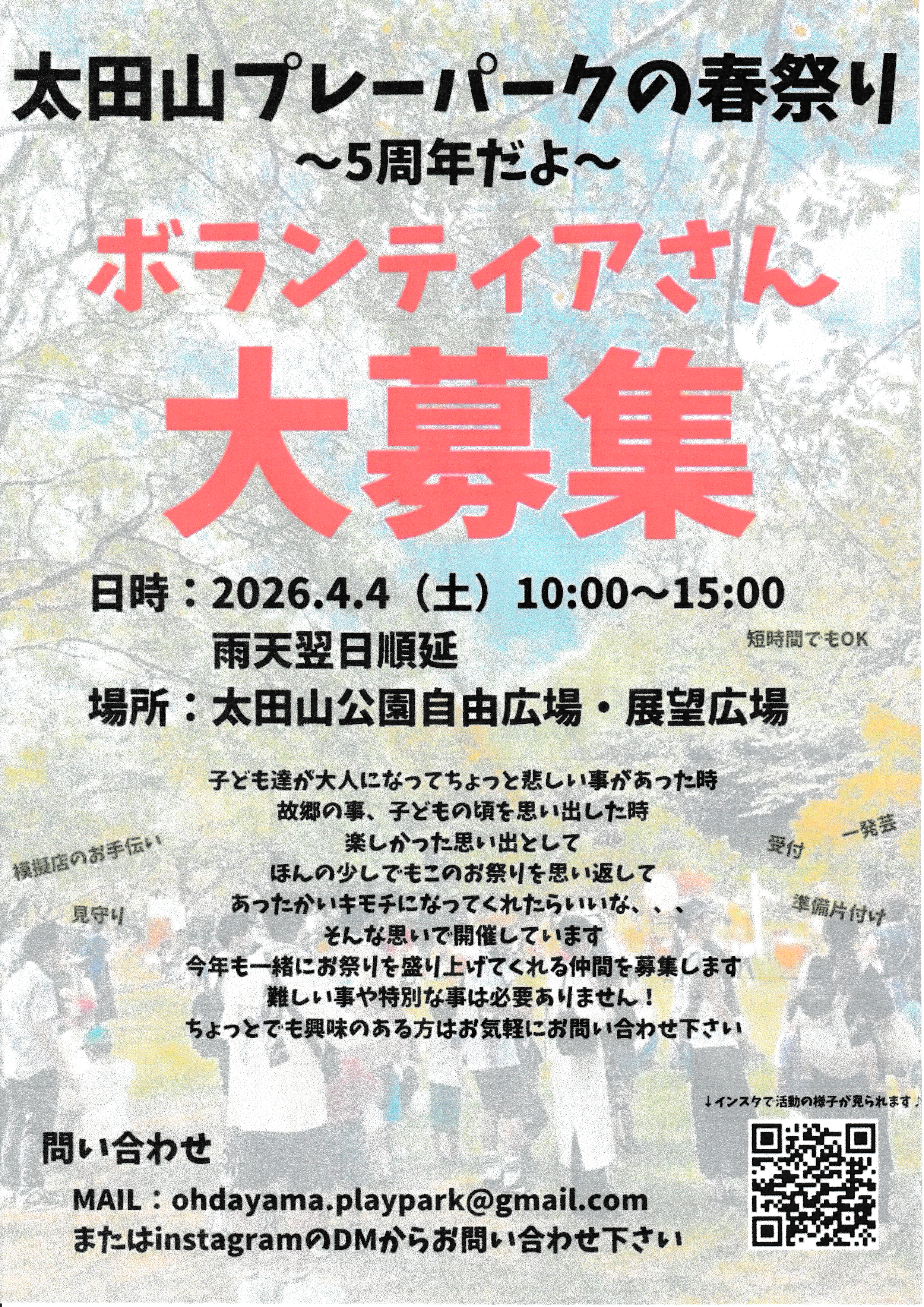 日時:2026.4.4(土)10:00~15:00 雨天翌日順延 場所:太田山公園自由広場・展望広場